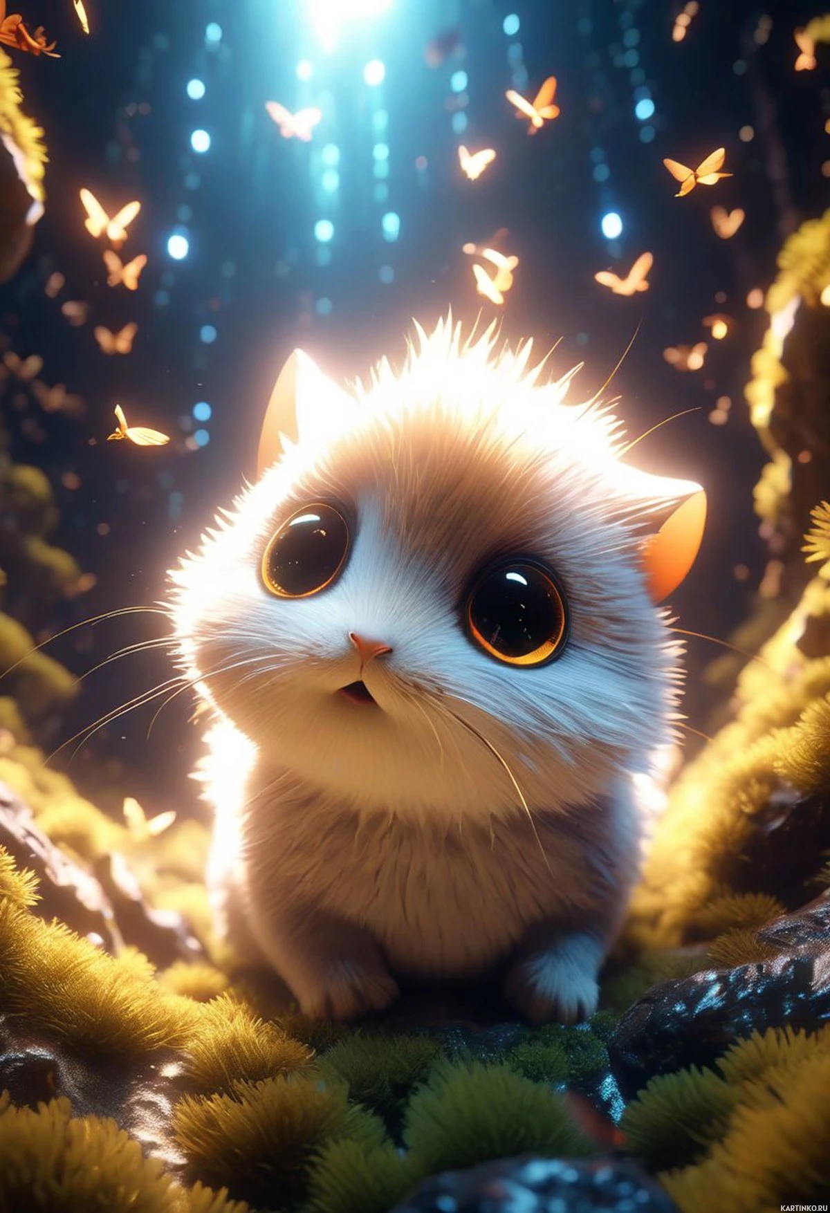 the soft lighting and presence of butterflies. The overall mood of the image is serene and whimsical.
