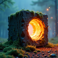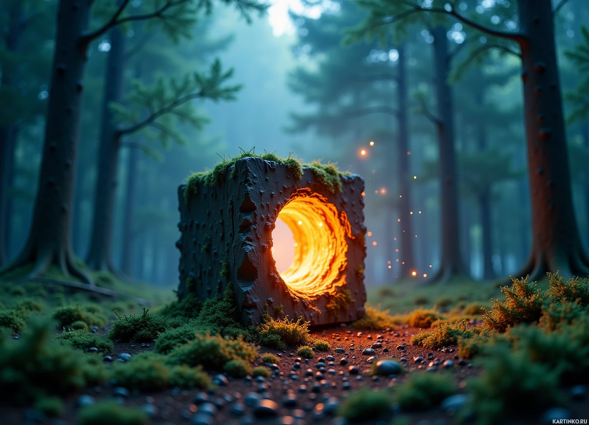 The image features a stone structure embedded in a forest setting. Atop this structure, a round hole is illuminated from within by a warm glowing light source. The surrounding trees cast long shadows on the ground, indicating that the sun is low in the sky or possibly it's night time.