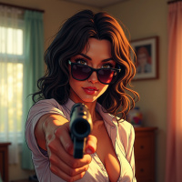 a female character, who appears to be a brunette with sunglasses. She is wearing what looks like