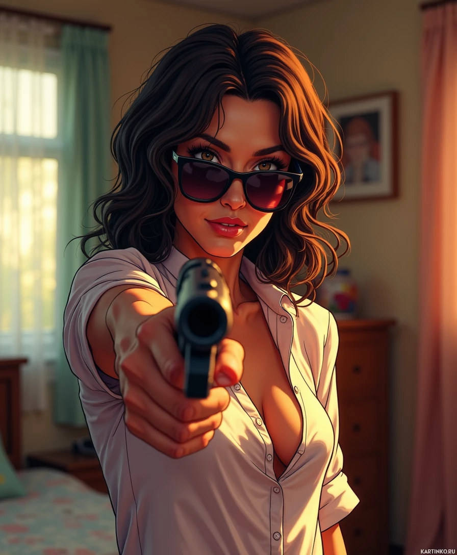 a white blouse and is holding a pistol in her right hand. Her posture suggests she is aiming the gun at something or someone off-frame, and there is
