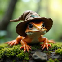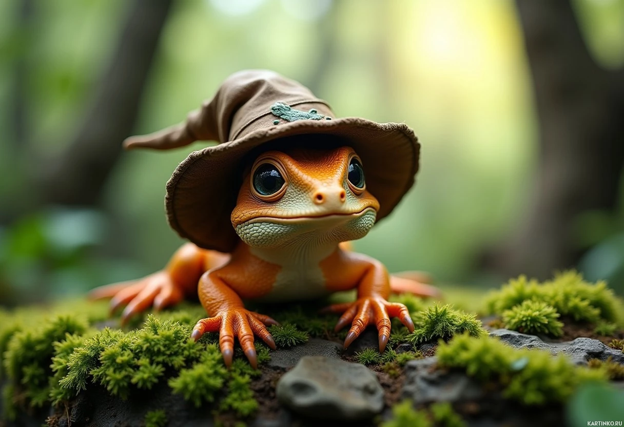 На картинке изображена ящерица в шляпе в стиле ведьмы. Она сидит на камне, поросшем мхом. На заднем плане виднеется лесистая местность с деревьями и клочками травы.