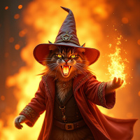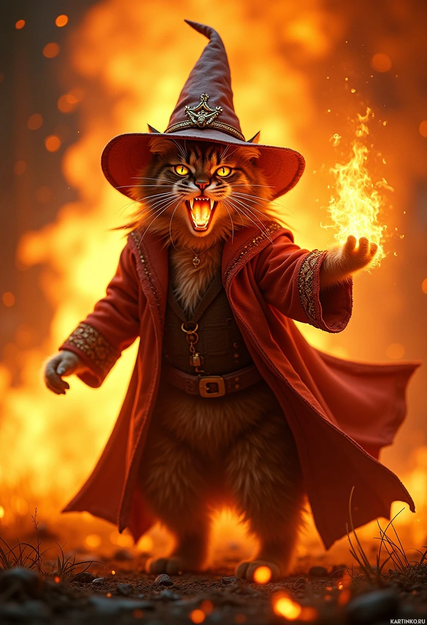 a red cape and hat that resemble a traditional magician's attire. The cat has a wide-eyed expression and its mouth is open as if shouting or casting a spell. Behind the cat, there is
