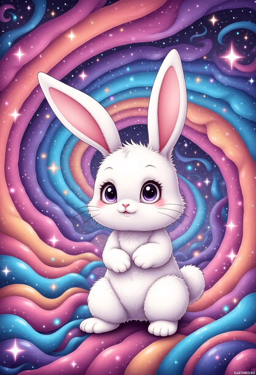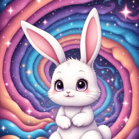 a cute rabbit. The bunny has big, cartoon-like eyes and is depicted in profile with one paw raised as if waving or greeting. It's sitting on what appears to be a cloud, which is surrounded by a galaxy-like backdrop filled with