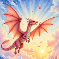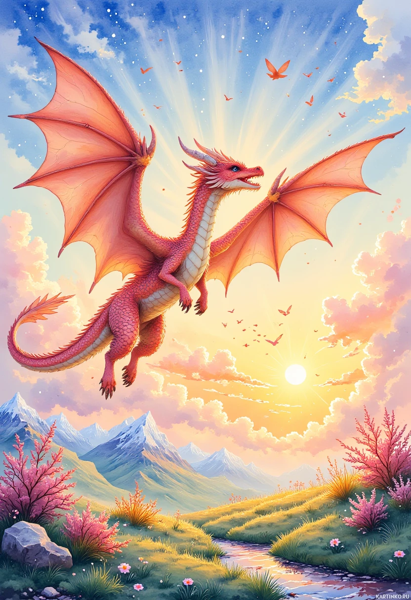 a fantastical scene featuring a dragon in flight. The dragon is large, with vibrant
