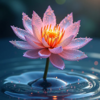 a pink flower, specifically a lotus blossom, in full bloom. The flower is situated on the water's surface and appears to be creating tiny ripples around it. There are
