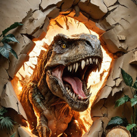 In this image, there is a depiction of a scene featuring a dinosaur. The central figure is an animated Tyrannosaurus with its mouth open in what appears to be a roar or a shout. It seems to have burst through