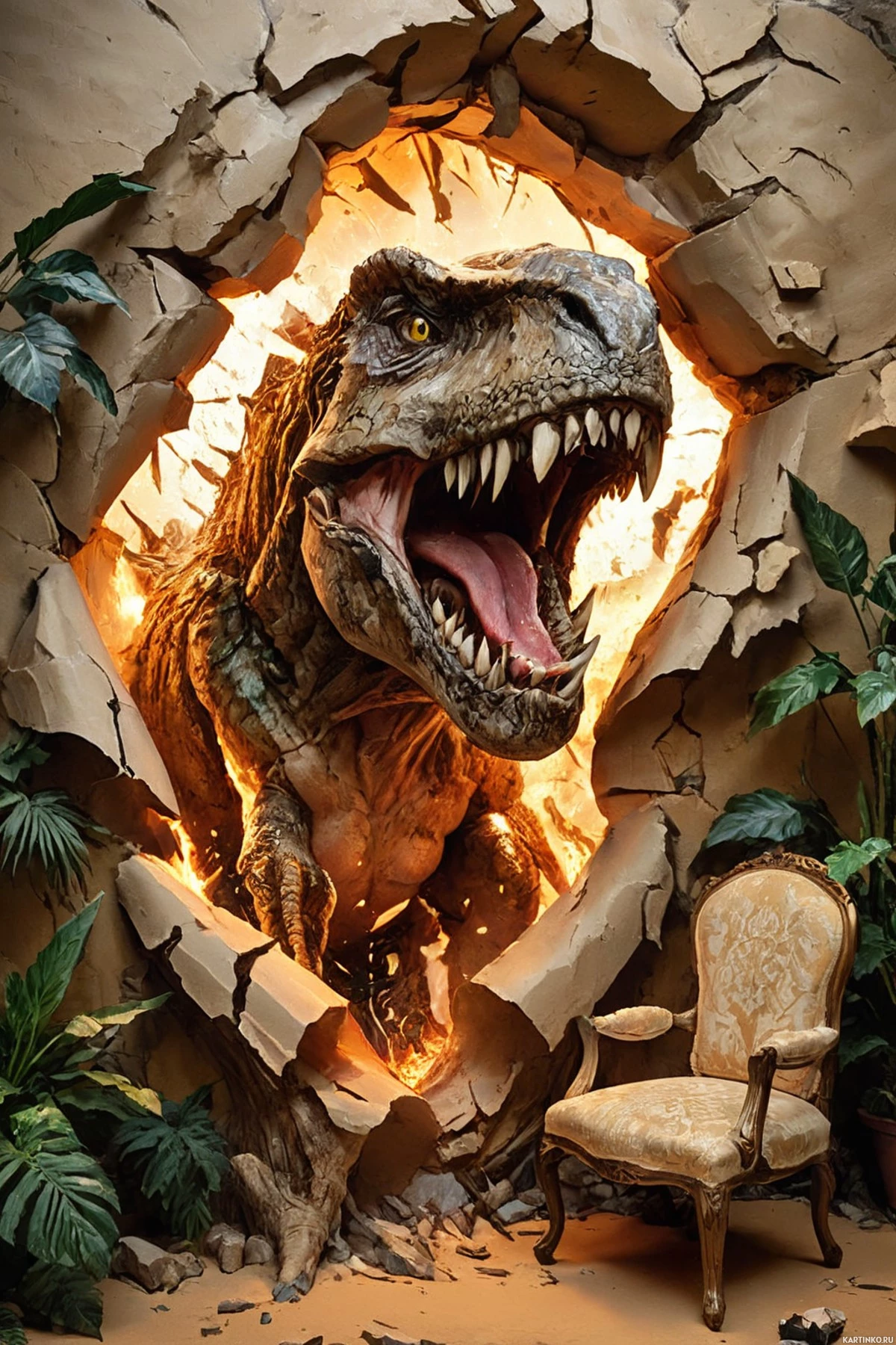 the wall of a room into which it has entered. The room is furnished with a chair and two plants, one on either side of the dinosaur's pathway. The walls are adorned with posters, but their content is not clearly visible in this image. There is a cracked ceiling from which smoke or dust appears to be billowing outward. The style of the artwork suggests it could be an illustration for a book or a cover for