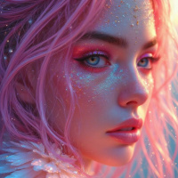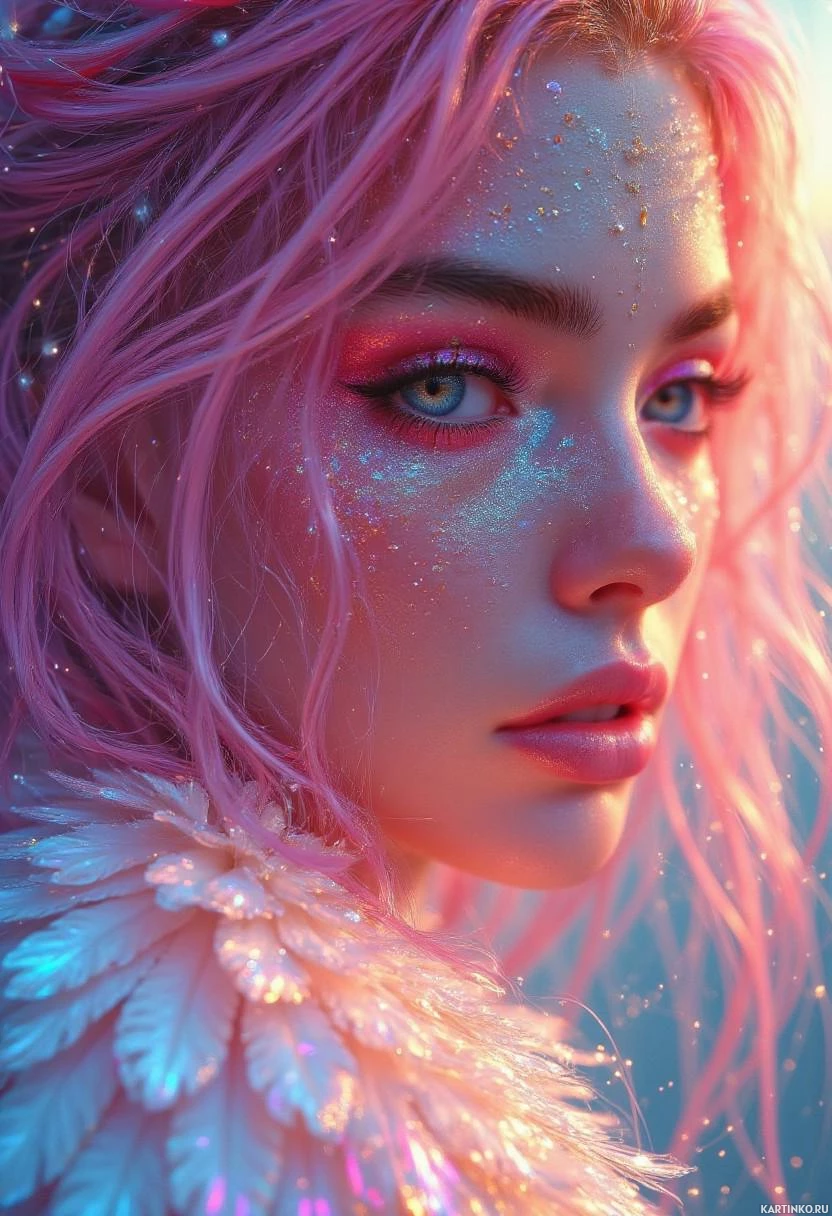 shades of pink and purple, enhancing her eyes and lips, which are complemented by glittery details. She has sparkly skin, giving the impression that she is adorned with stars or similar decorations. Her hair appears to be styled in waves, contributing to a mystical or fantasy-like appearance. The background of the image features a blend of blue and purple tones, with what seems like