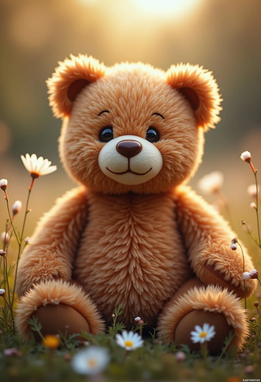 На картинке плюшевый мишка сидит на земле, окруженный полем цветов. Солнце светит позади него, лепестки цветов видны на переднем плане, создавая мягкое свечение. Фон размыт, что подчеркивает акцент на мишке. Сцена вызывает ощущение тепла и умиротворения.