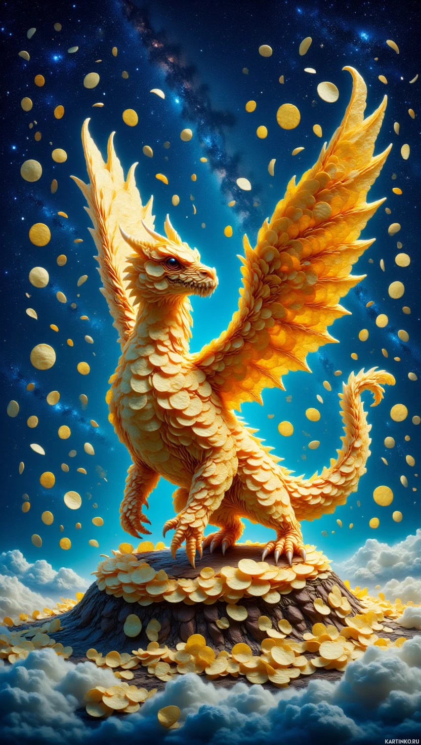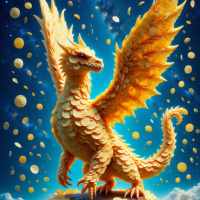 a fantastical creature, resembling a dragon or griffin, with the body of a bird and the head of a lion. This creature is adorned in gold and stands majestically atop a pile of golden coins, which are spread out around it like stars in