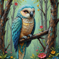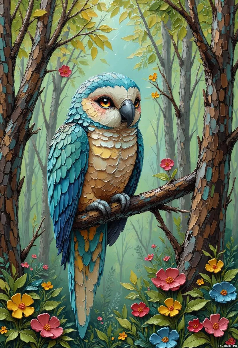 metallic sheen, suggesting they might have iridescent properties. Around the parrot, there are bright,