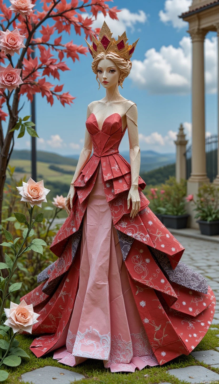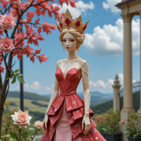 blonde hair and is adorned with a red crown that has a jewel at the center. The doll is positioned outdoors on what appears to be