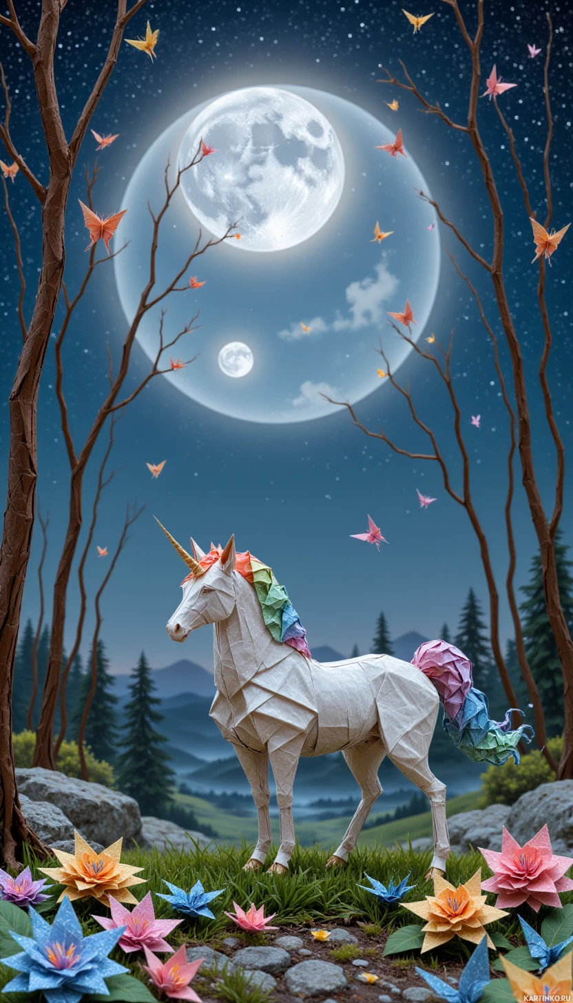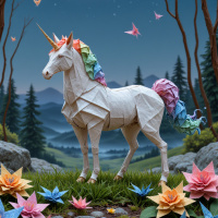 a magical scene with a unicorn as the main subject. The unicorn is standing on lush