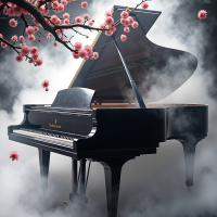 The image features a grand piano against a backdrop of smoke and a branch with pink blossoms. The piano is prominently positioned in the center, while the branch with flowers extends to one side. The background has a dark ambiance due to the presence of the smoke.