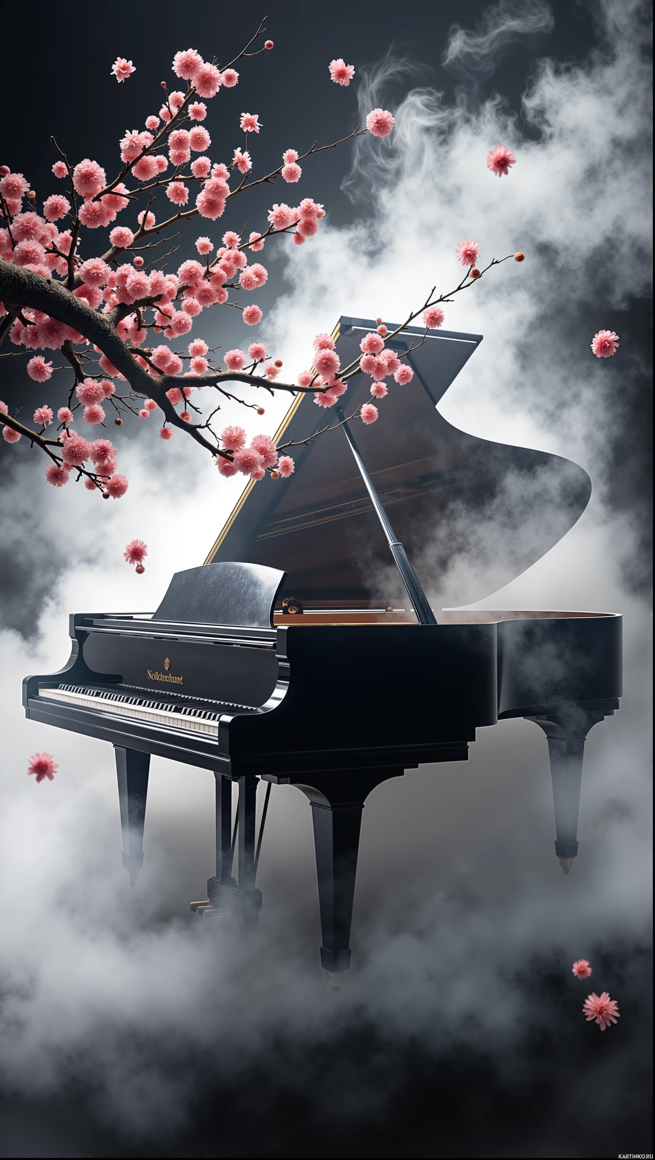 На картинке – рояль на фоне дыма и ветки с розовыми цветами. Рояль расположен в центре, а ветка с цветами тянется в сторону. Дым создает мрачную атмосферу фона.