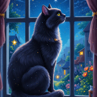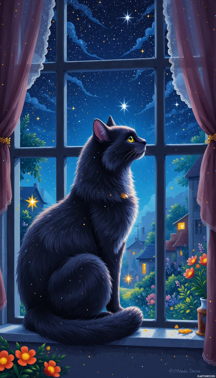 a black cat sitting by an open window at night. The sky outside is dark with stars visible, suggesting a calm and
