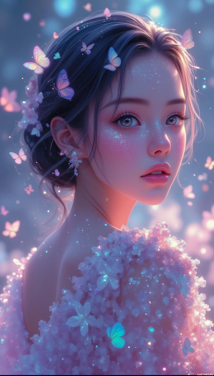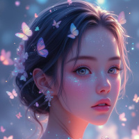 floating butterflies in shades of blue and purple, adding an ethereal and dreamlike quality to the image. These butterflies appear to be either flying towards or away from her face. The girl is adorned with what seems to be