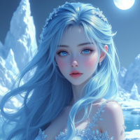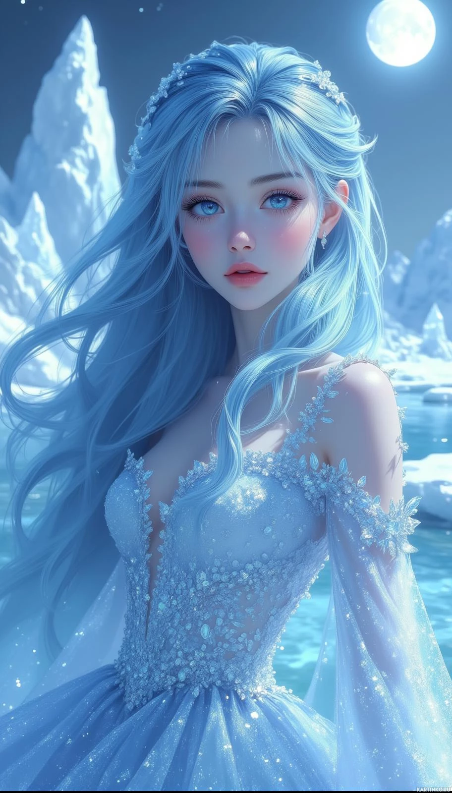a night scene featuring icy blue tones, possibly suggesting a chilly or magical environment. The moon is visible in the sky, which adds to the ethereal and enchanting atmosphere of the image. There are also subtle icicles on the ground, reinforcing the cold setting. The overall composition creates an impression of a storybook character living in a fantasy world.