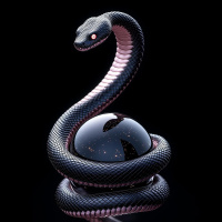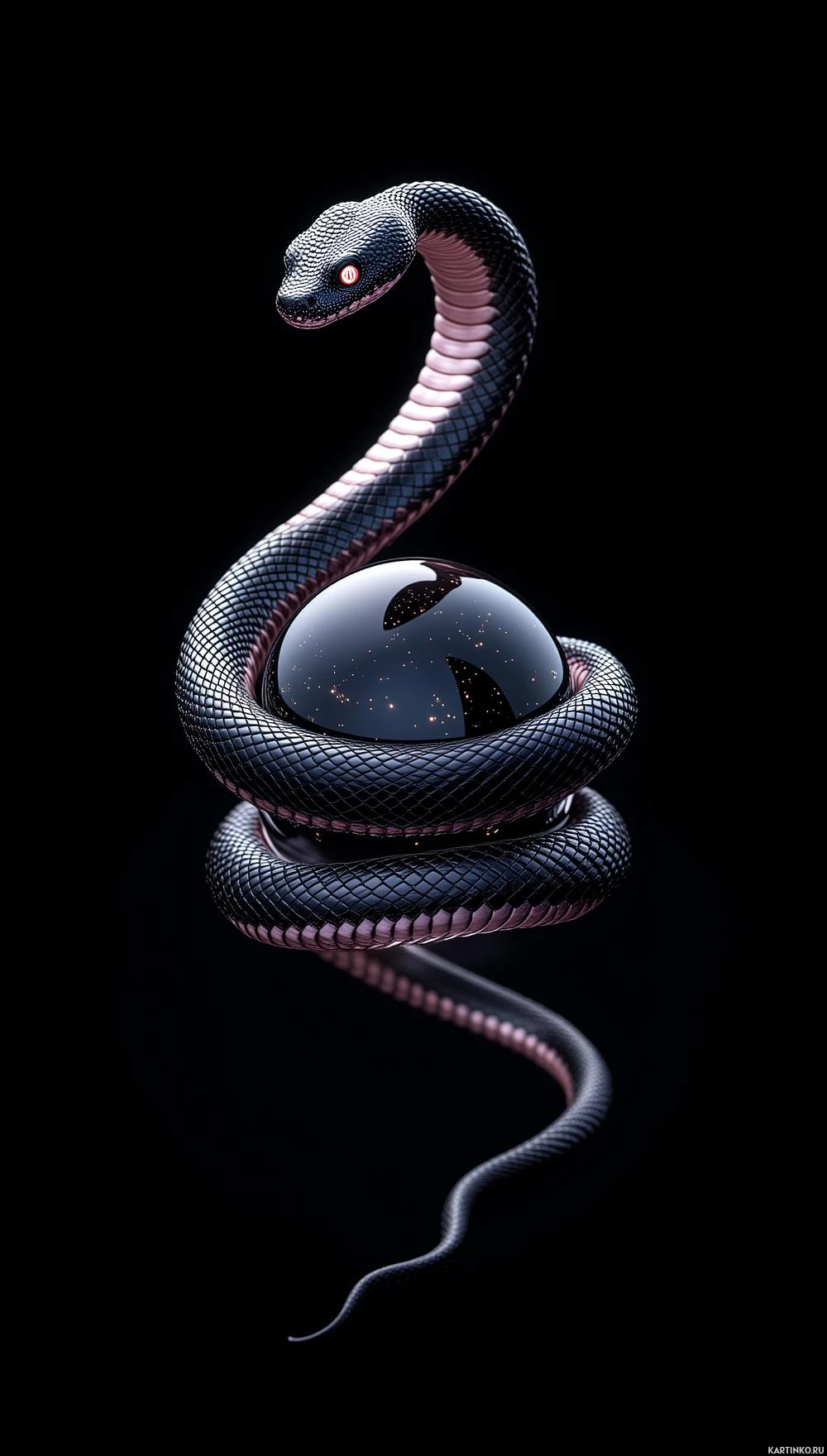 The image features a digital artwork of a snake. It is coiled in an S-shape, with its head facing towards the top right corner and its body twisting counterclockwise. At the center of the coil is a sphere. This sphere has