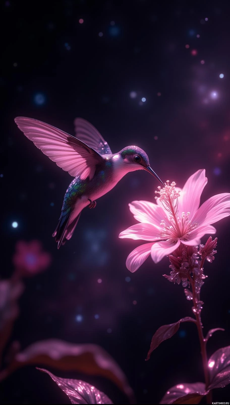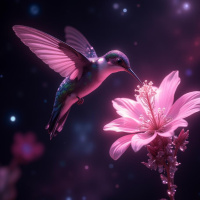 In the image, there is a hummingbird perched on a flower. The hummingbird has iridescent blue and green plumage with