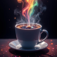 the coffee cup add to the whimsical atmosphere. The background is dark, which helps to highlight the colorful smoke and the coffee cup as