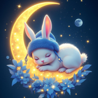 single star twinkling above the moon, enhancing the celestial theme. 3. Two large flowers, resembling delphiniums or tall lilies, providing a natural frame for the sleeping bunny and contributing to the garden-like setting. 4. Small sparkles floating around the bunny, suggesting stars falling from the sky, adding a touch of whimsy and enchantment. 5. The backdrop is a deep blue color that complements the moonlit atmosphere and gives a sense of depth. 6. A faint outline of what seems to be a planet or a celestial body in the upper left corner contributes to the cosmic theme. 7. The overall image has a soft focus, which blurs the background and highlights the sleeping bunny as the main subject, emphasizing its peaceful state. The image is likely used for purposes such as artwork or decoration due to its dreamy and calming nature.