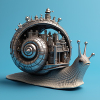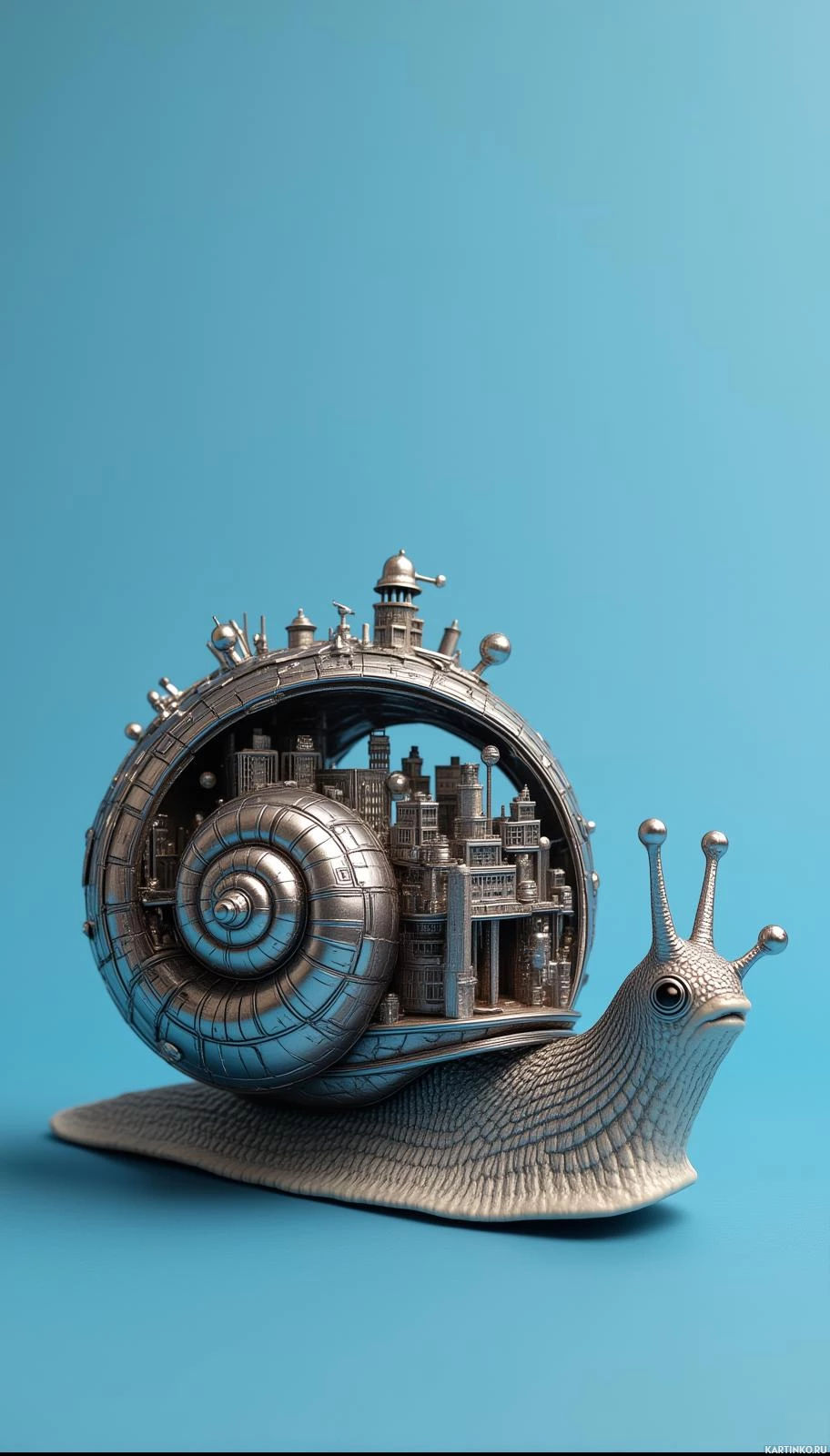 На картинке изображён улитка, на спину которой воссоздан детализированный миниатюрный город и пейзаж. Это пример фотоманипуляции, где тело животного заменяется сложной сценой для создания причудливого или художественного эффекта.