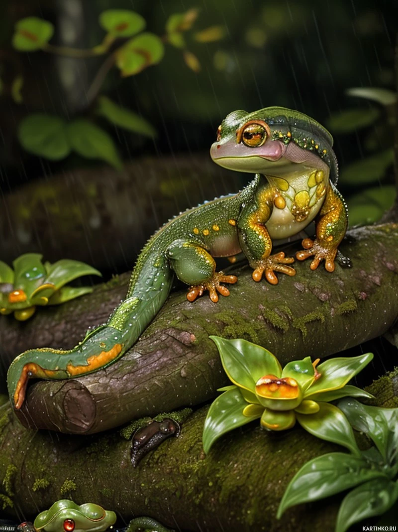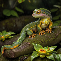 a tree branch with what appears to be raindrops in the background. Surrounding the frog are various plants and other frogs, which suggests that it is depicting