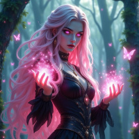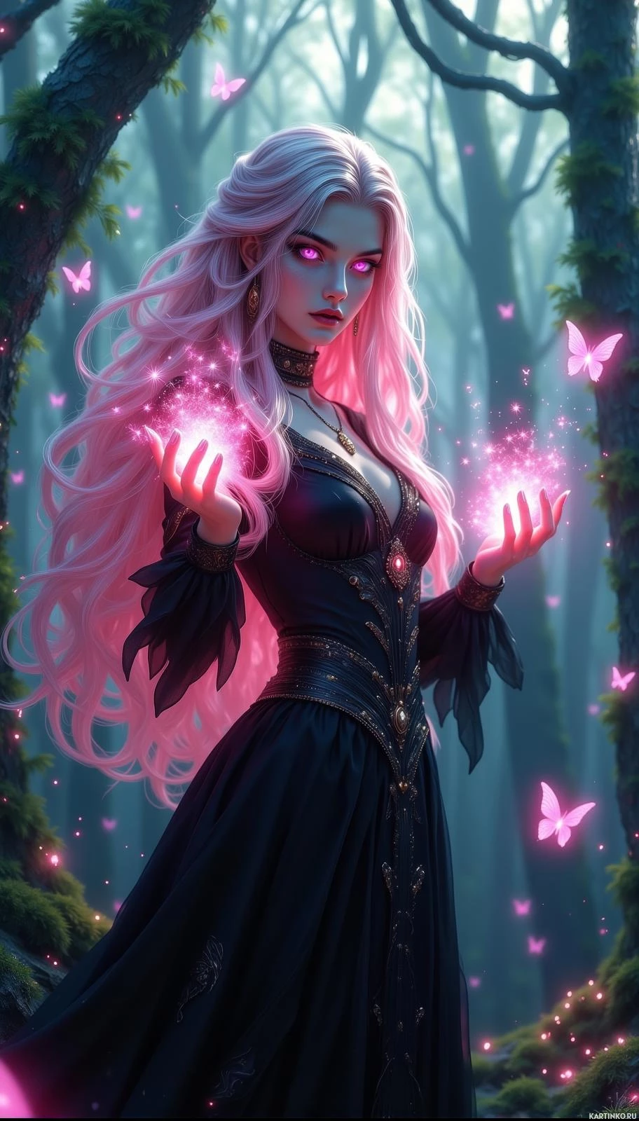 pink hair, set in what appears to be a forest or magical setting. She is dressed in