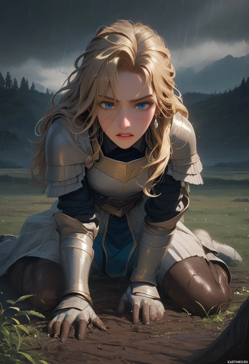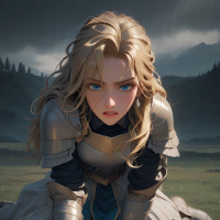 blonde hair and blue eyes. She is wearing what appears to be medieval armor, suggesting she may be from
