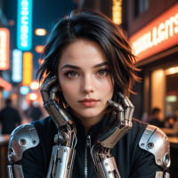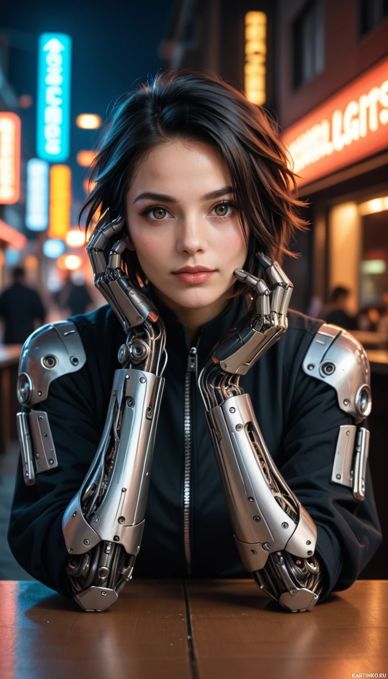 a young woman with short brown hair, seated at a table. She is wearing futuristic-
