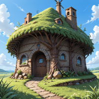 The image shows a stylized cartoon house with a fantastical design resembling a cottage from fairytale stories. It has a thatched roof, a chimney on the right side, and a single door with a wooden archway at the bottom. Above the door, there are two windows with white frames and curtains. The house is surrounded by greenery and grass. There's a small path leading to the door, bordered by stones on each side. The sky above is clear blue, suggesting it might be daytime.