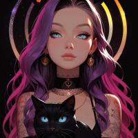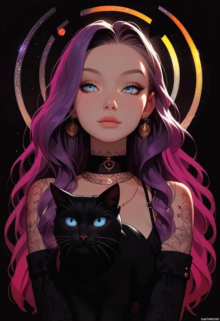 a black cat, its eyes wide open, seemingly looking directly at the viewer, which adds a sense of connection between the girl and the cat. Behind them is a circular backdrop featuring