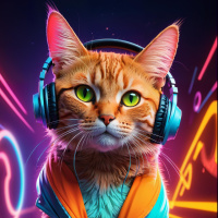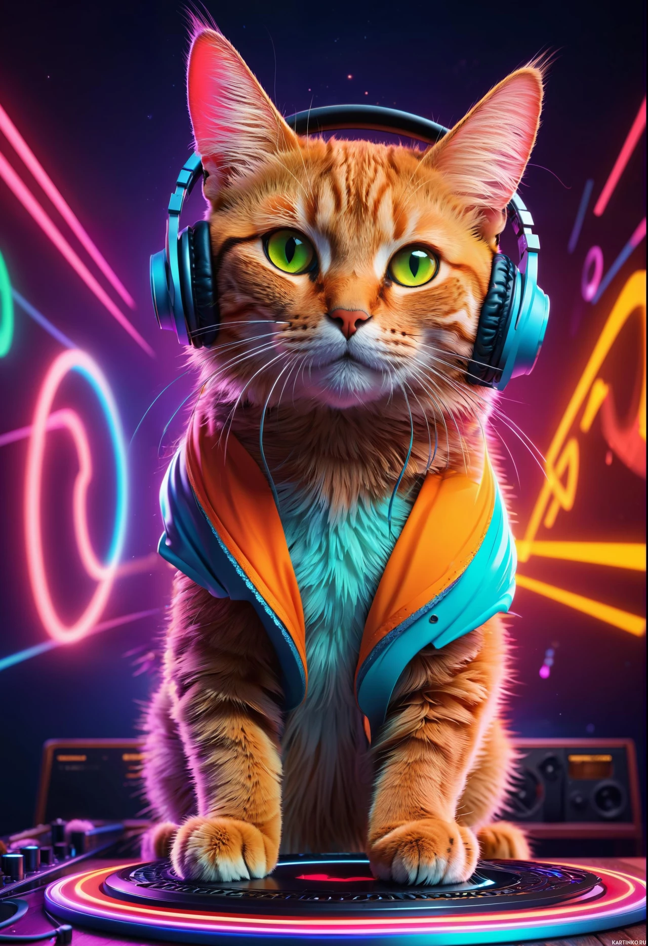 yellow eyes and an orange-striped coat. The cat appears to be sitting on what looks like a DJ mixing console. It has headphones placed over its ears, giving it a playful appearance as if it were a DJ. The background of the image features vibrant