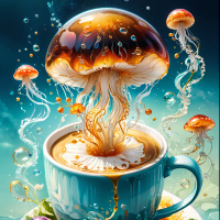 a whimsical scene where a cup of coffee is being enchanted by jellyfish. The jellyfish are emerging from the coffee in an animated manner, adding