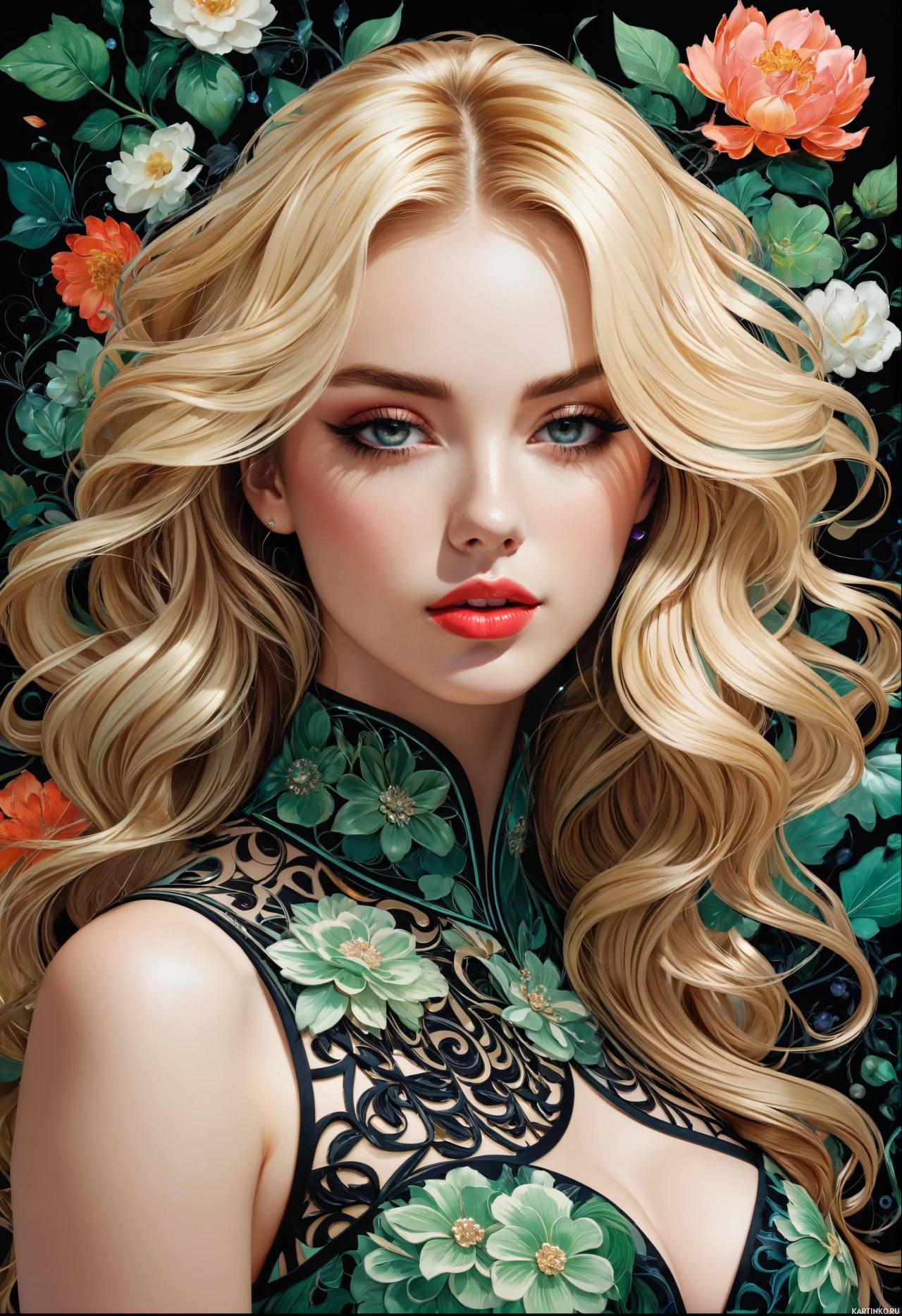 a loose wave, cascading down her shoulders, contributing to an ethereal appearance. Surrounding her head are floral elements, possibly petals or