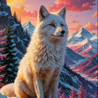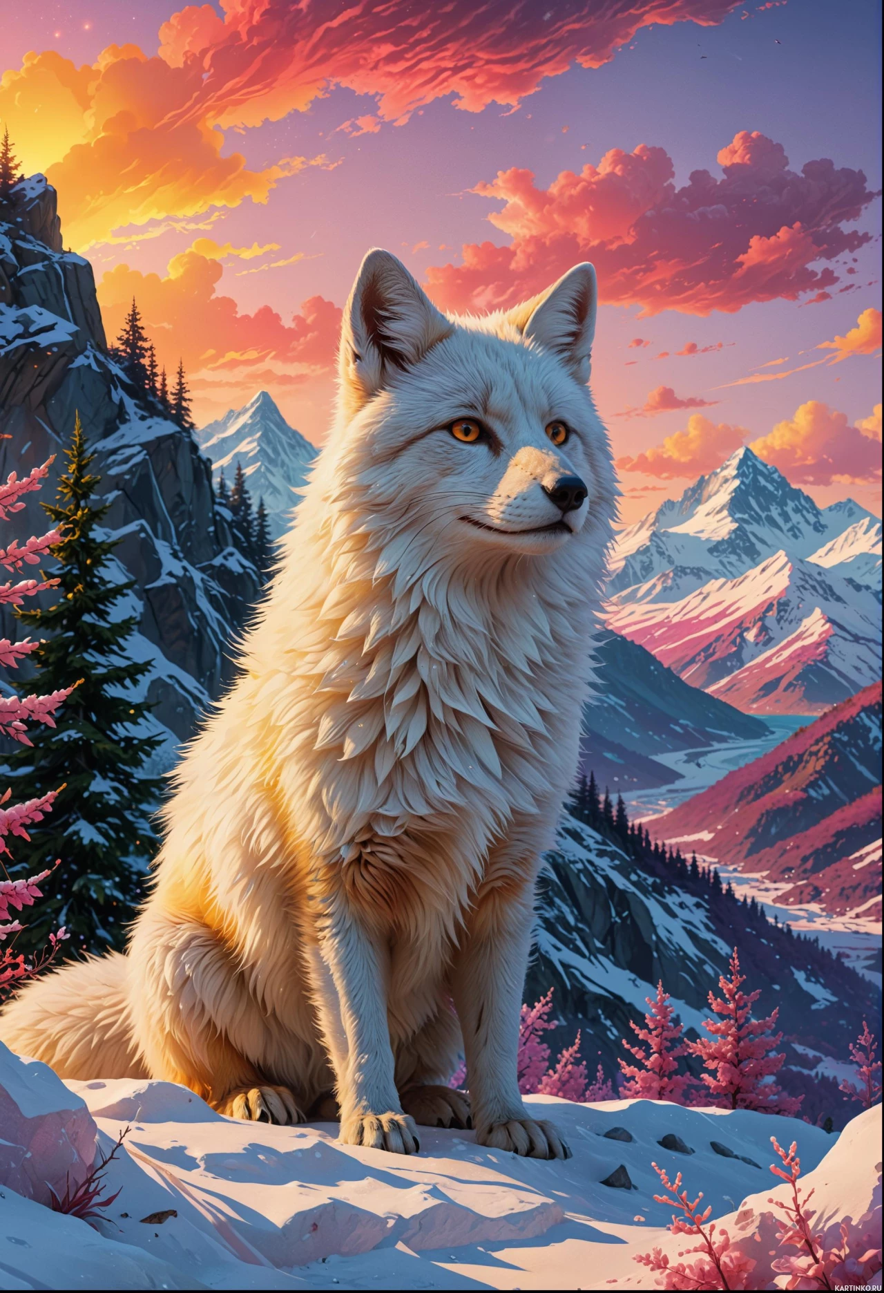 a majestic wolf standing on a snow-covered mountain. The wolf, with its fur appearing thick and dense, is facing the viewer directly, giving the impression of a calm yet