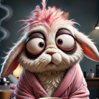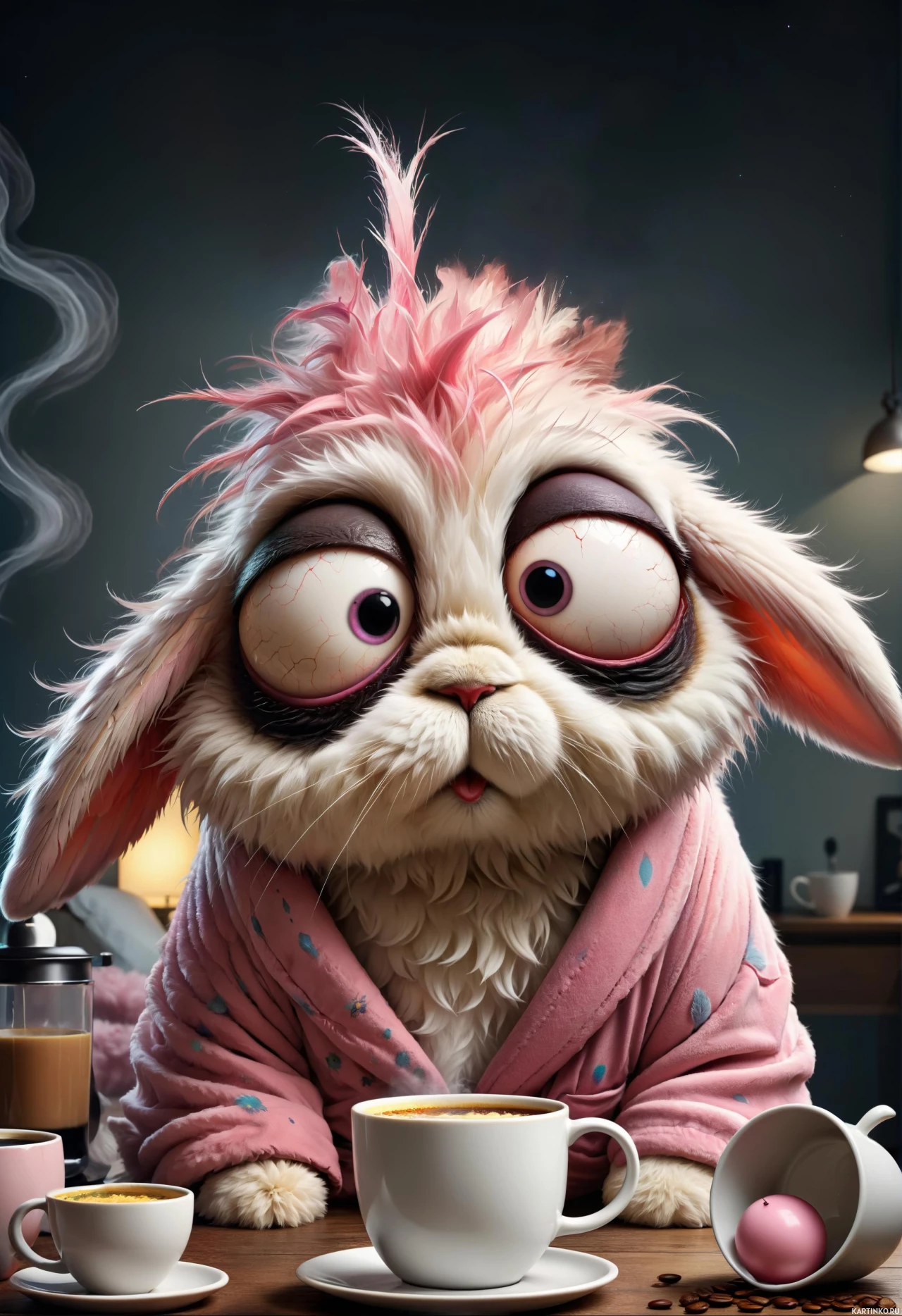 coffee mug is prominently placed on the table in front of the character, and there's steam rising from the surface of the drink, suggesting it's hot. To the left of the mug, there's a small bowl that contains what appears to be a hard-boiled egg. The rabbit is dressed in pink pajamas, which adds to its anthropomorphic look. The overall setting appears cozy and inviting, with warm lighting that highlights the textures of the coffee mug and the fur of the rabbit.
