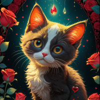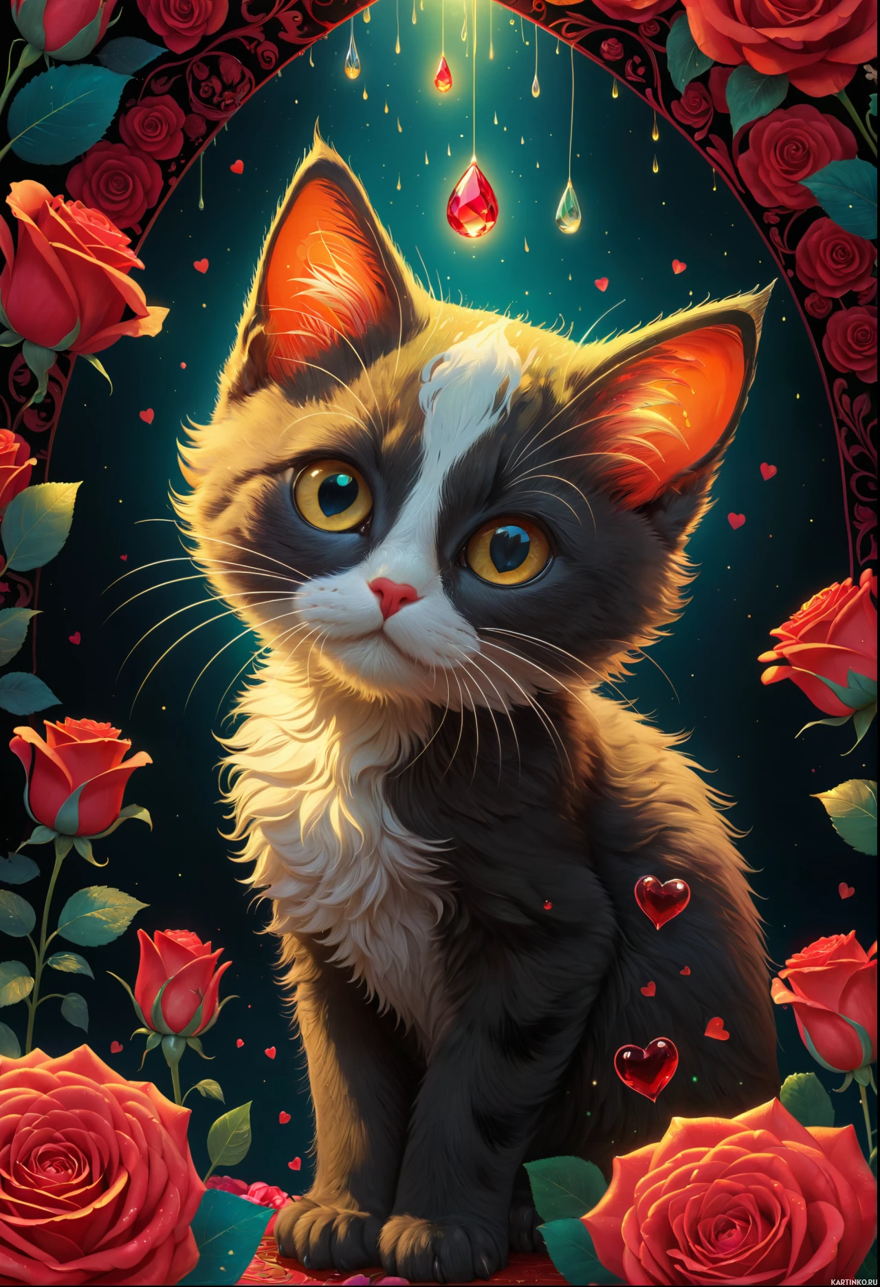 fantasy art, often associated with whimsical or magical themes due to the presence of roses and the ethereal quality of the cat's expression.