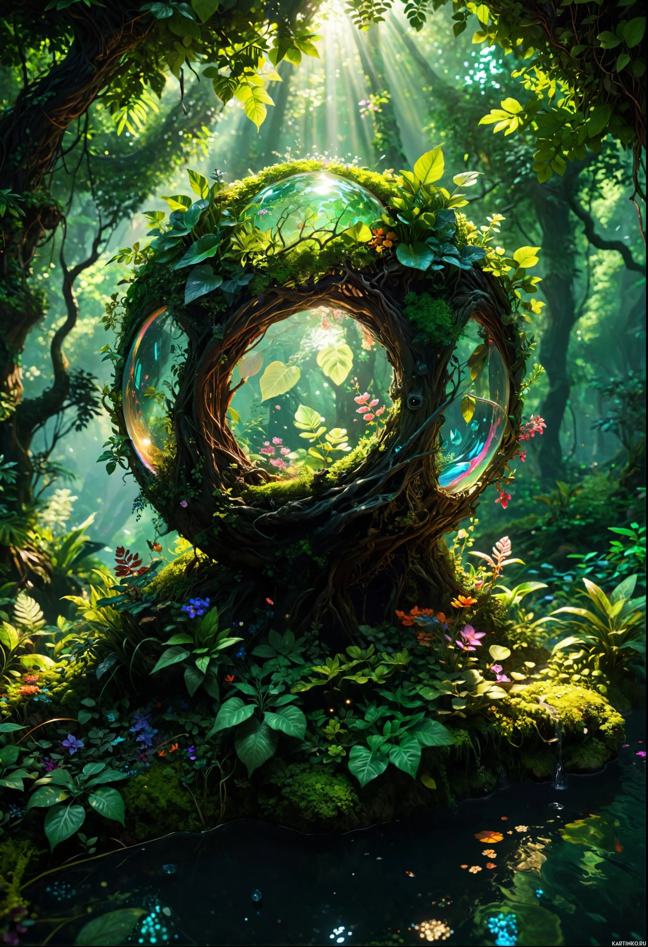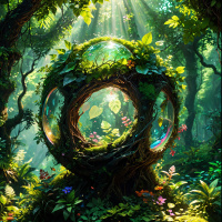 forest scene with an otherworldly tree at its center. This central tree appears to be a large, glowing orb that is encircled by vines and foliage, creating the appearance of a magical, hollow