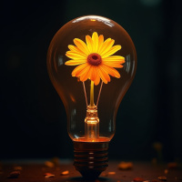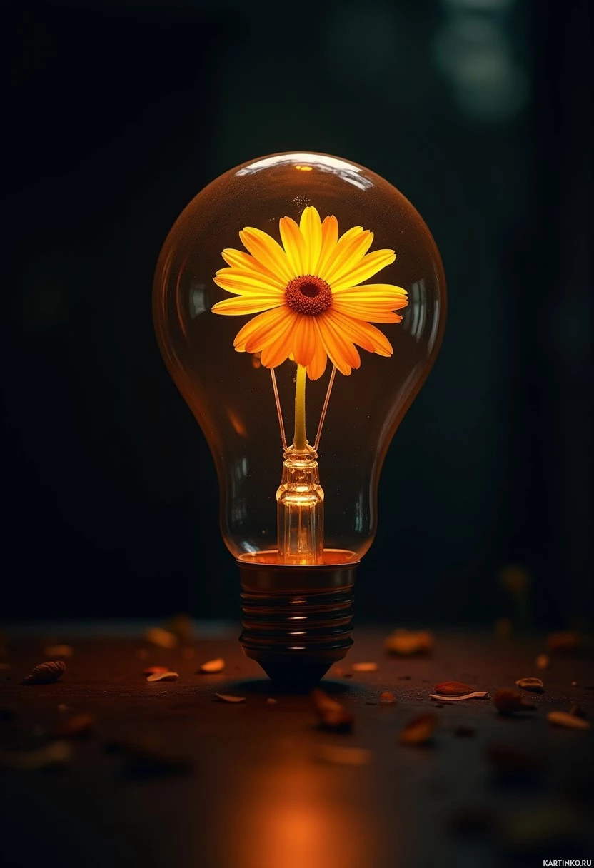 yellow flower with orange and black center petals, standing upright within an incandescent light bulb. The bulb has a translucent casing through which the filament is visible. The bulb appears to be unlit, allowing for