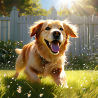 droplets of water behind from what looks like a recent splash in the air. The background includes a fence made of vertical wooden slats, and there are