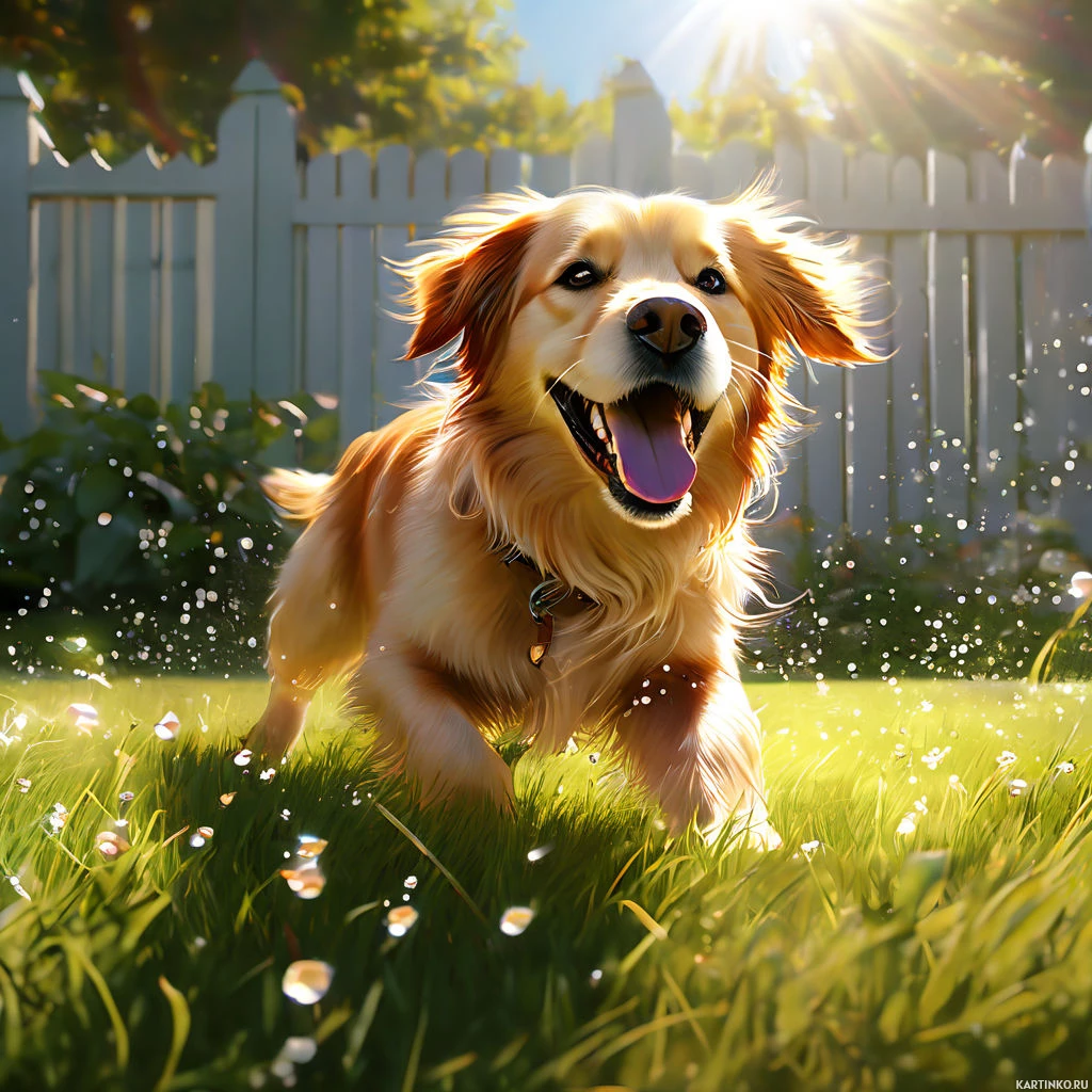 green lawn. The dog's fur is shining in the sunlight, and it has its tail up high, wagging excitedly with