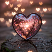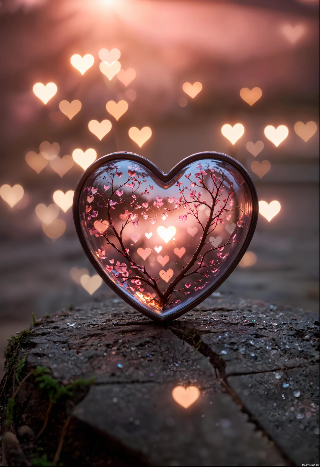 pink hue emanating from within the heart, representing the blossoms on the branches. The heart is placed on a rock or similar surface. Outside the heart, numerous