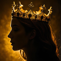 The image shows a profile of a woman looking upward with her eyes closed. She is wearing what appears to be a crown, suggesting that she might be depicted as royalty or a figure of importance. The lighting is warm and seems to focus on the top half of her face, creating a silhouette effect that enhances her features and adds depth to the image.