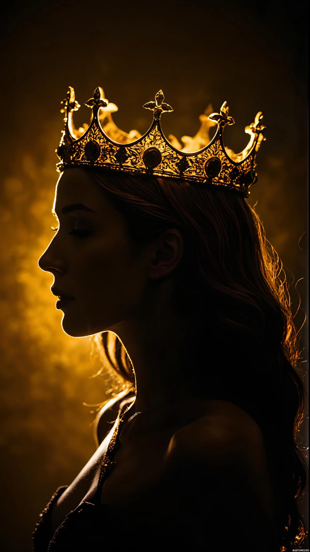 На картинке изображен профиль женщины, смотрящей вверх с закрытыми глазами. На ней, похоже, корона, что может намекать на её знатное происхождение или значительную роль. Теплое освещение фокусируется на верхней части лица, создавая эффект силуэта и подчеркивая черты, придавая картинке глубину.