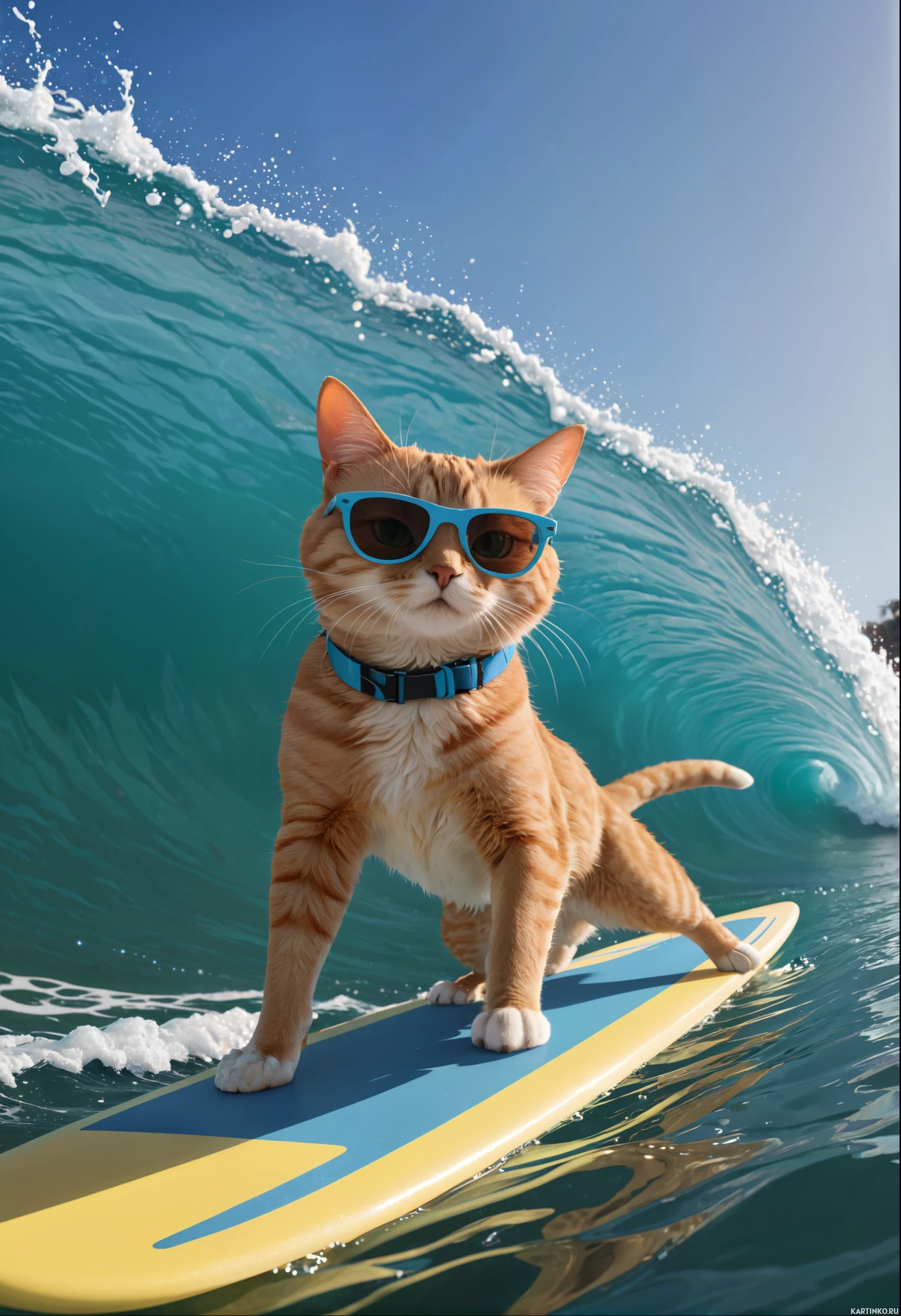 The image depicts a cat sitting on a surfboard. The cat is wearing sunglasses, giving it a relaxed and adventurous appearance. The ocean around the surfboard has waves that suggest motion. There are no people or other animals in this picture, so there are no interactions between the cat and any other beings visible. This image likely appeals to those who enjoy whimsical or humorous pet photography.
