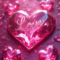 На картинке изображена коллекция граненных кристаллов, кажущихся розоватыми, что может указывать на рубины или похожие драгоценные камни. Кристаллы разбросаны на поверхности, напоминающей тёмно-серый или чёрный фон, что создаёт контраст с ярким розовым цветом кристаллов. В центре находится кристалл в форме сердца, выделяющийся благодаря своей форме и расположению. На кристаллическом сердце видны надписи, но разобрать их невозможно. В целом, картинка создает ощущение романтической символики, где кристалл в форме сердца явно отсылает к любви или нежности.