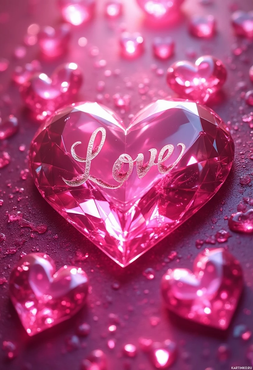 The image depicts a collection of faceted crystals that appear to be pink in color, suggesting they could be rubies or similar gemstones. These crystals are scattered on a surface that might be a dark grey or black backdrop, which contrasts with the vibrant pink of the crystals. In the center, there is a heart-shaped crystal that stands out due to its shape and central placement. The heart-shaped crystal also has inscriptions on it, but they are not legible in the context provided. The overall effect is one of romantic symbolism, with the heart-shaped crystal being a clear reference to love or affection.