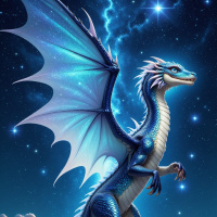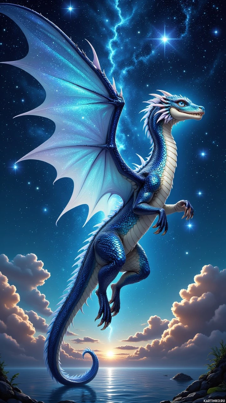 night sky with clouds scattered across it, giving an impression of depth and vastness. Below the dragon, there is